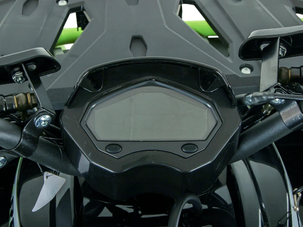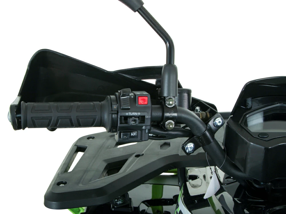 Комплектуется: электронной приборной панелью, имеет защиту рук, родительский контроль, шприцуемую подвеску, поворотники, пластиковые накладки на колеса, датчик уровня топлива, спинка, зеркала, подогрев ручек.