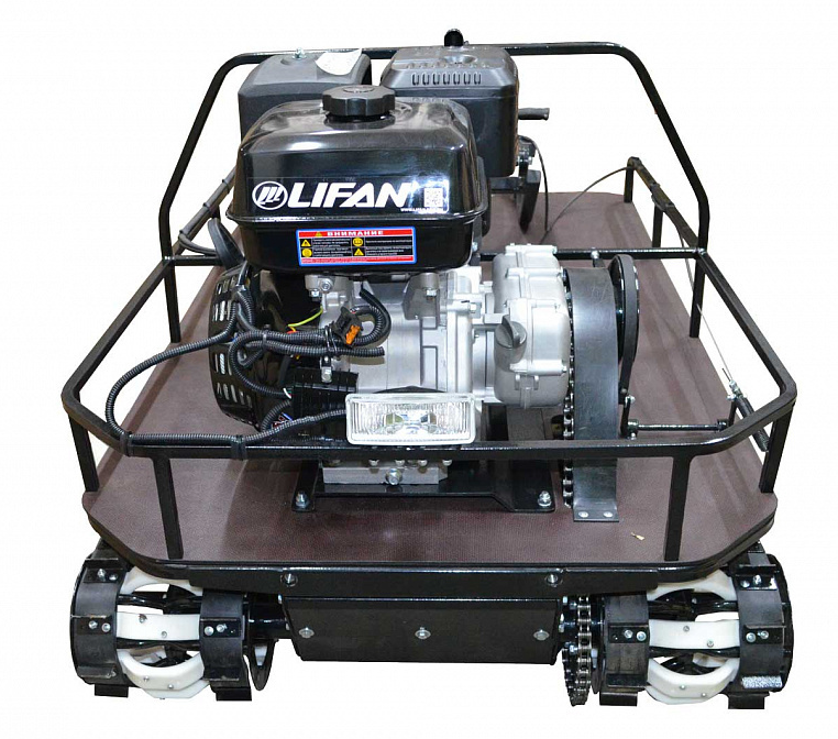 Гусеничная ходовая часть. Две широкие гусеницы, шириной - 210 мм, расположенные друг от друга на расстояние - 430 мм, что обеспечивает буксировщику большую точку опоры и при езде по неровным поверхностям не дают ему заваливаться набок. Гусеничная лента изготовлена из резинового полотна классификации «Арктик» с высоким содержанием высококлассного капрона и резины. Раздельные траки из высокопрочного и износостойкого полиуретана и стальные грунтозацепы по паре на каждый трак
