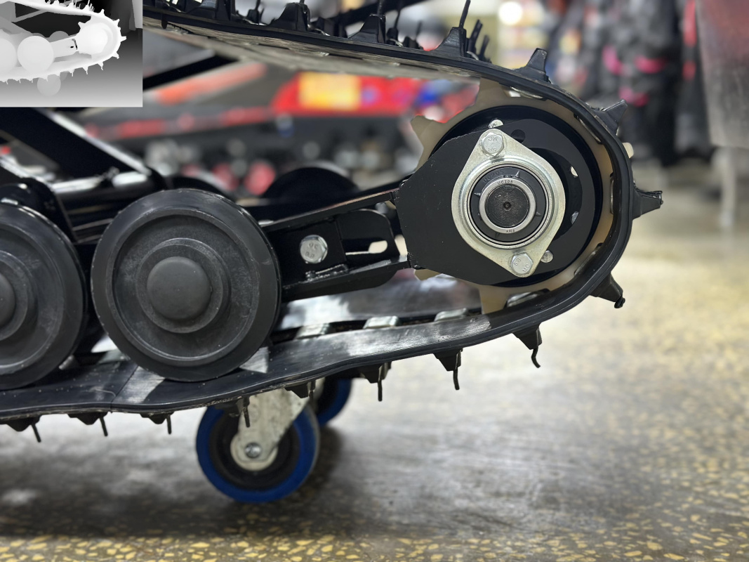* Уникальная геометрия катков и креплений. Это отдельная гордость разработчика снегохода YAKUT. Крепкие катки с уникальной кареткой не забиваются снегом и имеют значительно больший ресурс по сравнению с классическими Бурановскими катками.